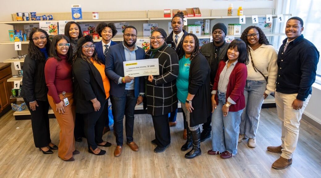 Featured Photo: A team of Dollar General employees, led by Jeremy West, President of the African American Resource Group, presents a check to Leigh Oliver, Executive Director of the Career Development Center, and the staff, to support the TSU Tiger Food Pantry. Photo by Aaron Grayson