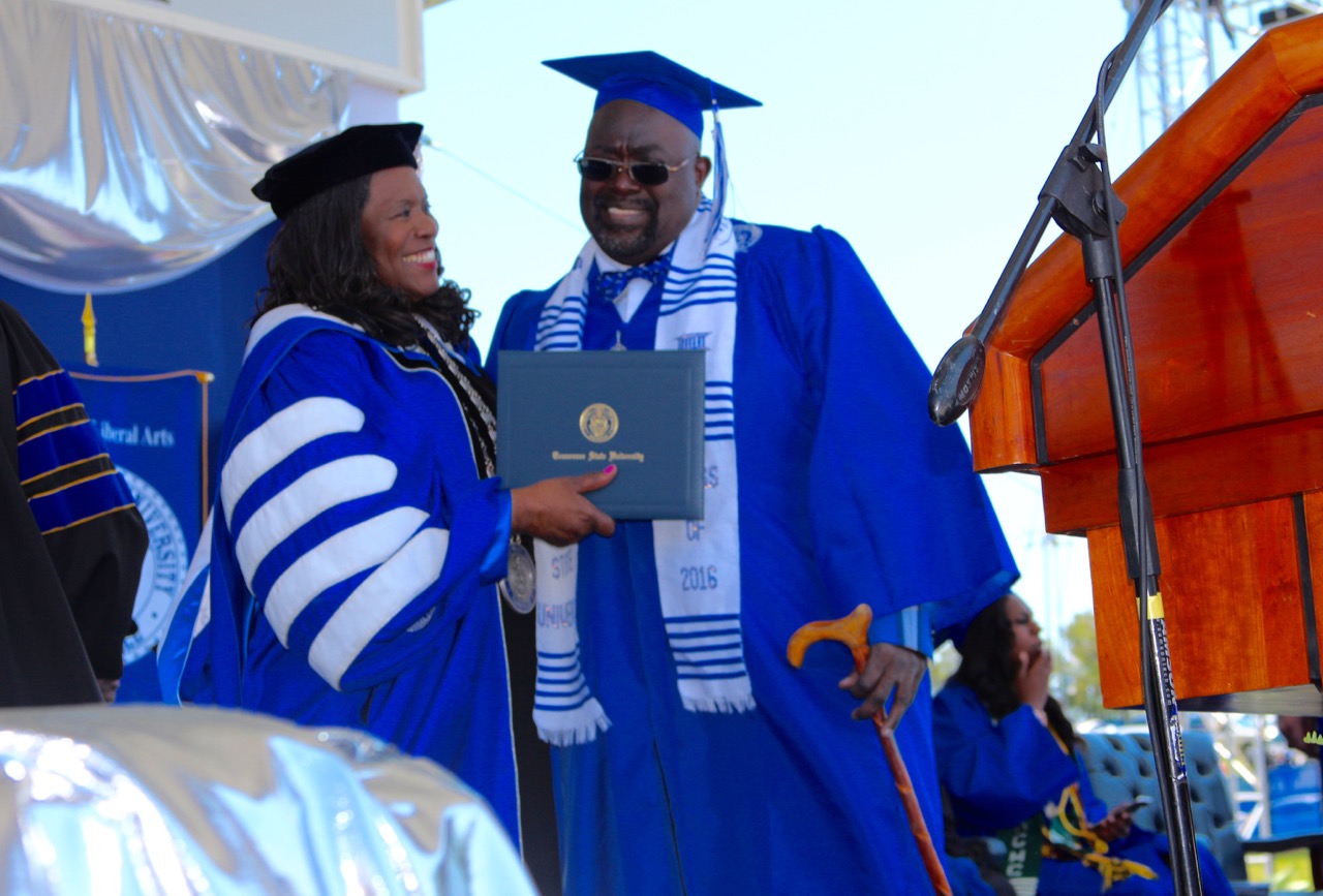NASHVILLE, Tenn. (TSU News Service) – When Jerry Priddy heard his name called at Tennessee State University’s spring commencement, the 48-year-old double amputee looked to the stands of Hale Stadium for his inspiration: his mother.